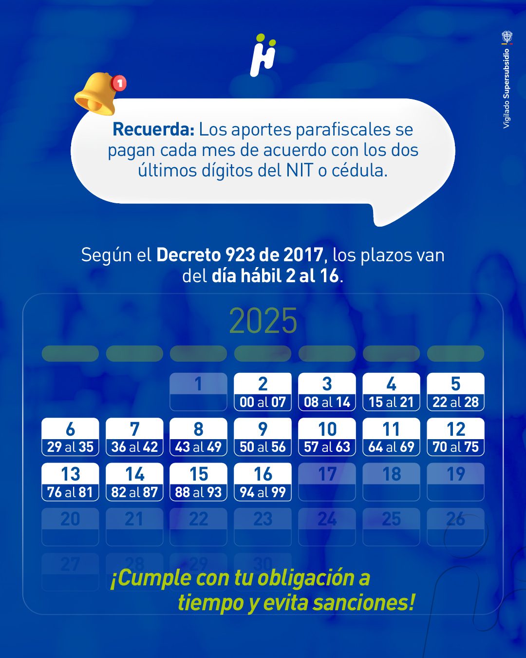 Los aportes parafiscales tienen una periodicidad mensual y se deben pagar de acuerdo a los plazos establecidos de acuerdo a los dos últimos dígitos del NIT o documento de identificación, Según el Decreto 923 de 2017 los plazos establecidos son: