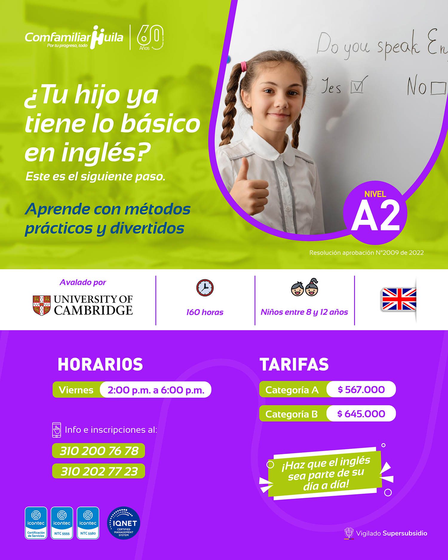 Comfamiliar Huila continúa fortaleciendo su oferta educativa con un programa de inglés dirigido a niños entre los 8 y 12 años, enfocado en brindar herramientas reales para su crecimiento personal y académico en un mundo cada vez más globalizado.