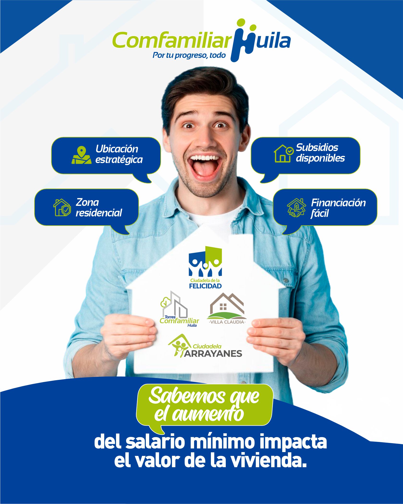 Como parte del compromiso institucional, Comfamiliar Huila también ha definido un incremento del 9,4 % en el valor de las viviendas VIS y VIP, muy por debajo del aumento nacional estimado, lo que representa una ventaja significativa para los afiliados. Esta condición especial estará vigente durante los meses de enero y febrero, convirtiéndose en una oportunidad clave para quienes están proyectando la compra de vivienda.