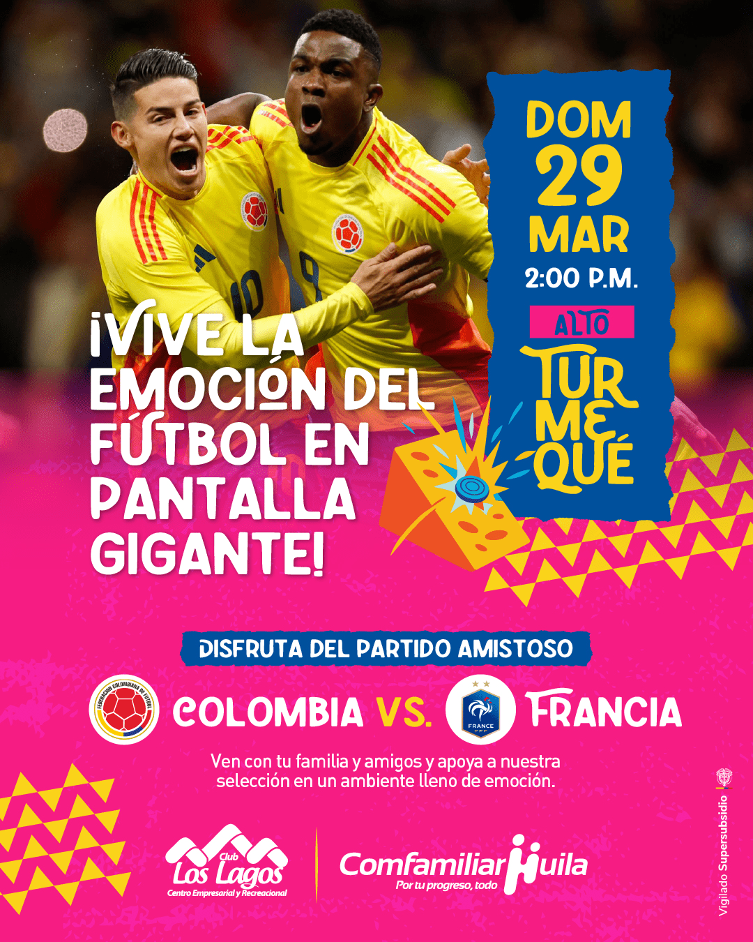 El Club Los Lagos de Comfamiliar Huila te invita a disfrutar de una experiencia única llena de emoción, fútbol y tradición. Este domingo 29 de marzo a las 2:00 p. m., vive el partido amistoso entre Colombia vs. Francia en pantalla gigante, en un ambiente ideal para compartir en familia y con amigos.