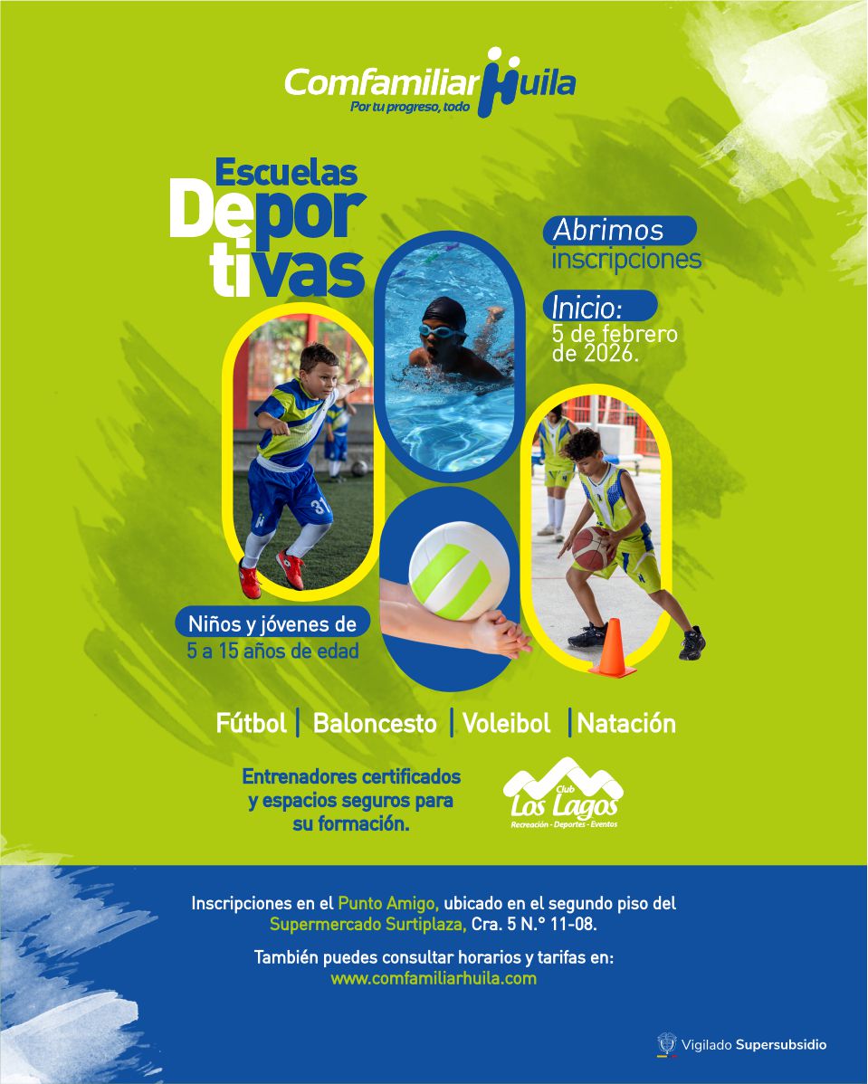 En Comfamiliar Huila seguimos promoviendo el bienestar y el desarrollo integral de niños, niñas y jóvenes del departamento. Por eso, a partir del 5 de febrero de 2026, abrimos oficialmente las inscripciones para nuestras Escuelas Deportivas, un espacio pensado para fortalecer habilidades físicas, emocionales y valores a través del deporte.
