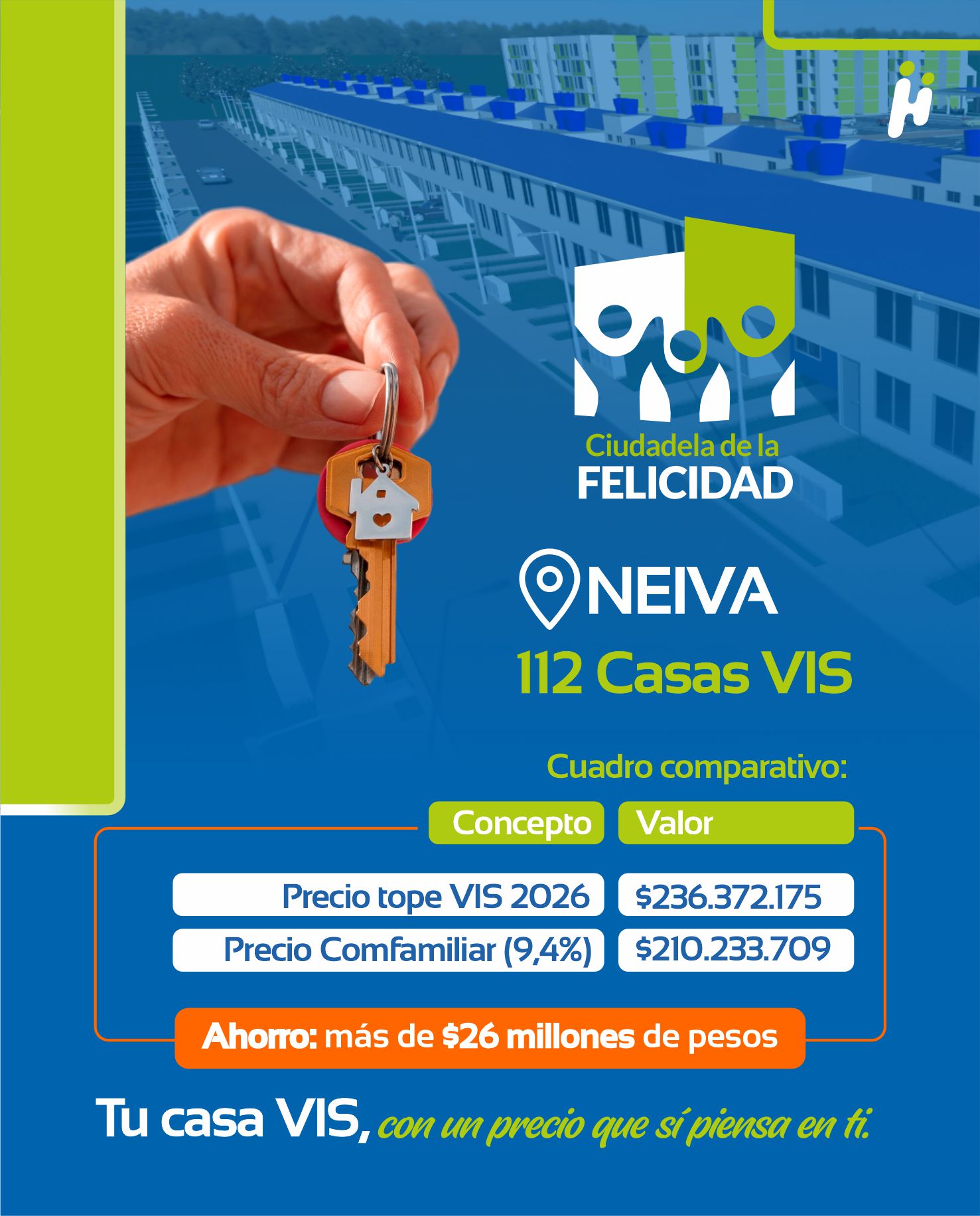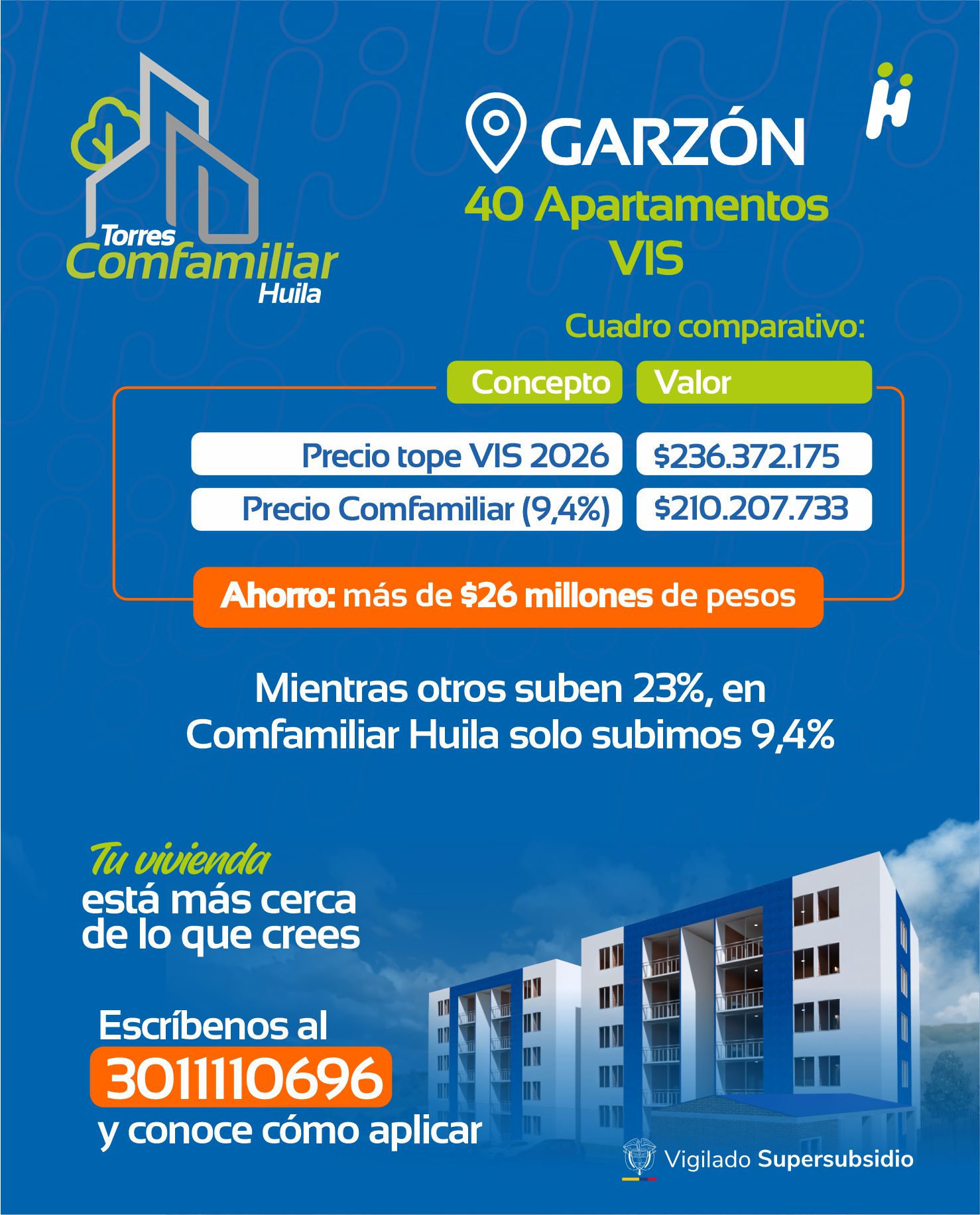 El aumento del salario mínimo en Colombia para 2026, cercano al 23 %, ha impactado directamente el valor de las viviendas VIS y VIP en el país. Sin embargo, en Comfamiliar Huila seguimos comprometidos con el bienestar de las familias huilenses, aplicando un incremento de solo el 9,4 %, muy por debajo del promedio nacional, lo que se traduce en un ahorro significativo para nuestros afiliados.