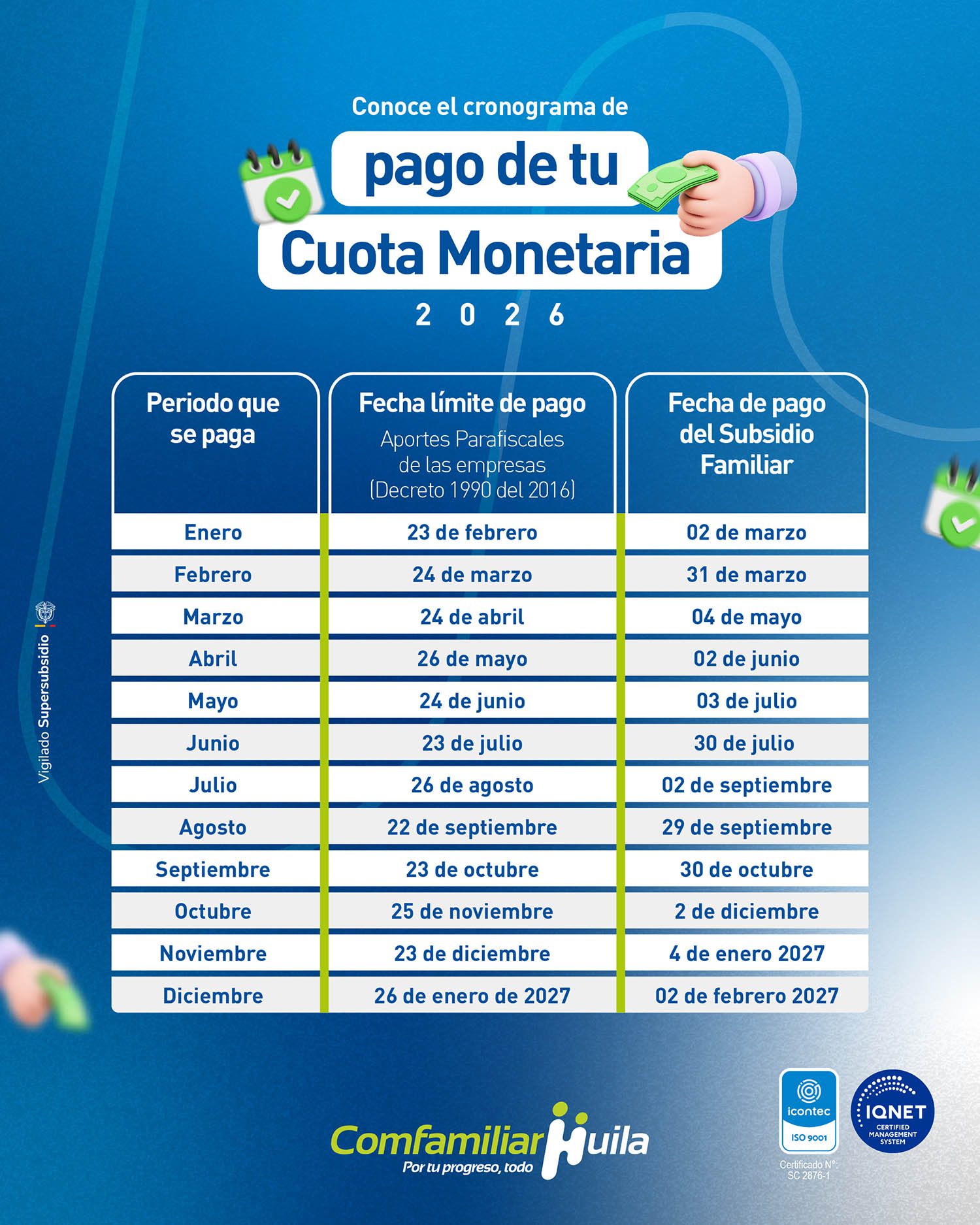 Cronograma de pago de la Cuota Monetaria 2026 de Comfamiliar Huila