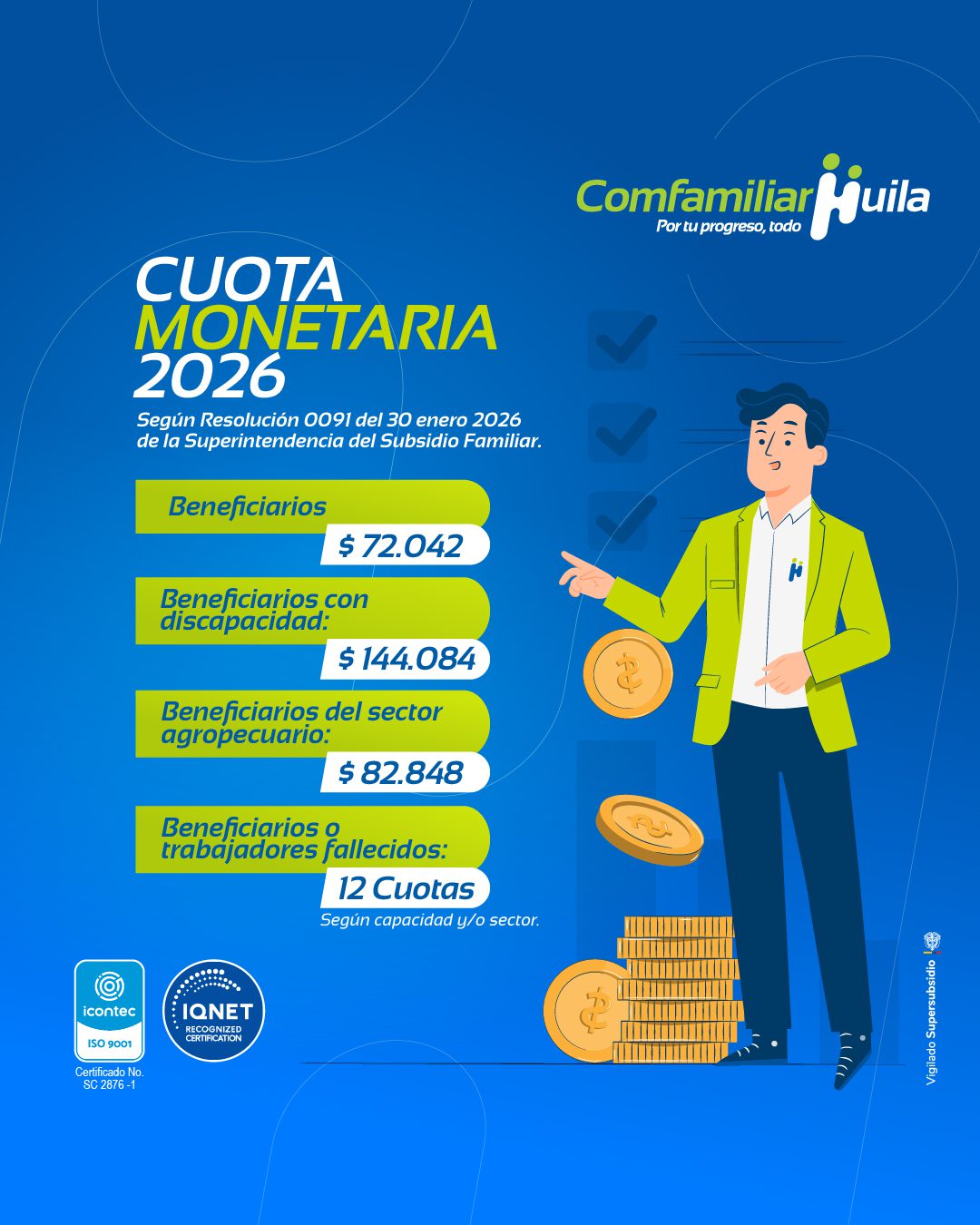 Comfamiliar Huila informa a sus afiliados que, conforme a la Resolución 0091 del 30 de enero de 2026, expedida por la Superintendencia del Subsidio Familiar, se definieron los nuevos valores de la Cuota Monetaria para el año 2026, un apoyo económico fundamental que busca fortalecer el bienestar de miles de familias huilenses.