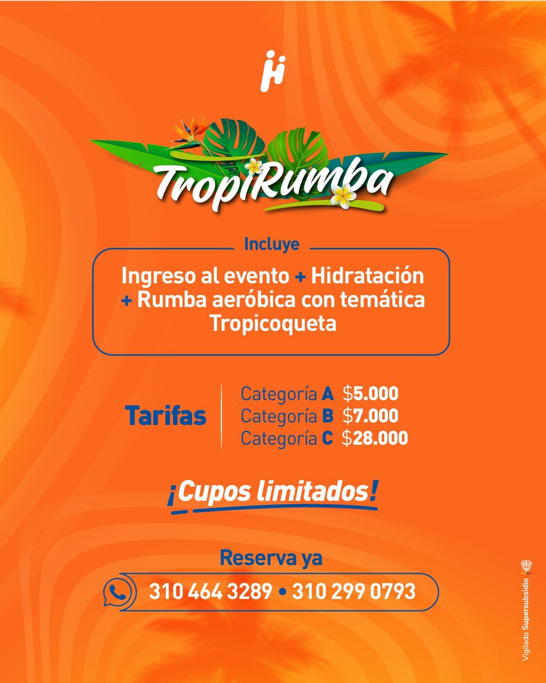 Durante la jornada podrás disfrutar de una rumba aeróbica con temática Tropicoqueta, diseñada para recargar energía, compartir en comunidad y vivir un espacio diferente. Además, tendrás hidratación incluida para mantenerte activo durante todo el evento.