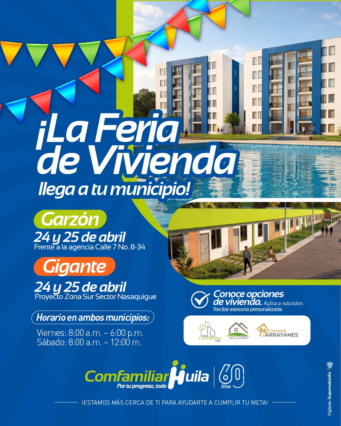 Comfamiliar Huila realizará la Feria de Vivienda en Garzón y Gigante los días 24 y 25 de abril, llevando oportunidades reales a las familias que buscan acceder a vivienda sin salir de su municipio.