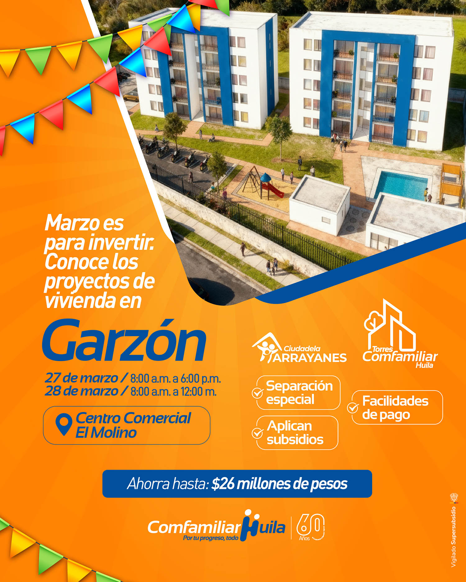- Se continuará recibiendo hasta el 50% del valor del Subsidio Familiar de Vivienda (SFV) para proyectos en Neiva, casas en Garzón y casas en Gigante, y hasta el 100% del SFV para apartamentos en Garzón.