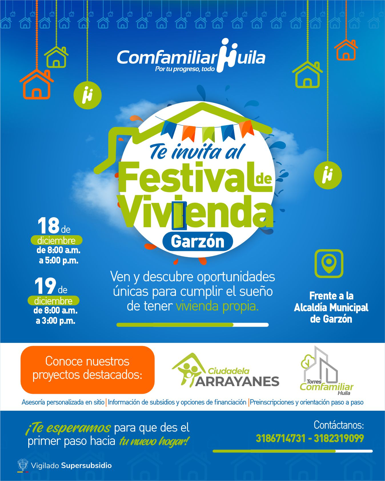 Comfamiliar Huila invita a todas las familias del departamento a participar en el Festival de Vivienda Garzón, un espacio pensado para acercar a los afiliados y a la comunidad en general al sueño de tener vivienda propia, con beneficios especiales durante la temporada decembrina.
