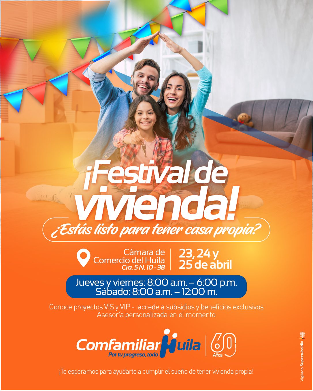 Del 23 al 25 de abril, Comfamiliar Huila realizará el Festival de Vivienda en la Cámara de Comercio de Neiva, un espacio pensado para quienes desean acceder a vivienda con mejores condiciones y acompañamiento directo.