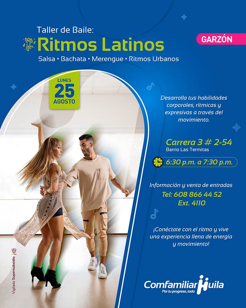 El lunes 25 de agosto de 2025 inicia en Garzón el taller de ritmos latinos de Comfamiliar Huila, un espacio para aprender y disfrutar salsa, bachata, merengue y ritmos urbanos.