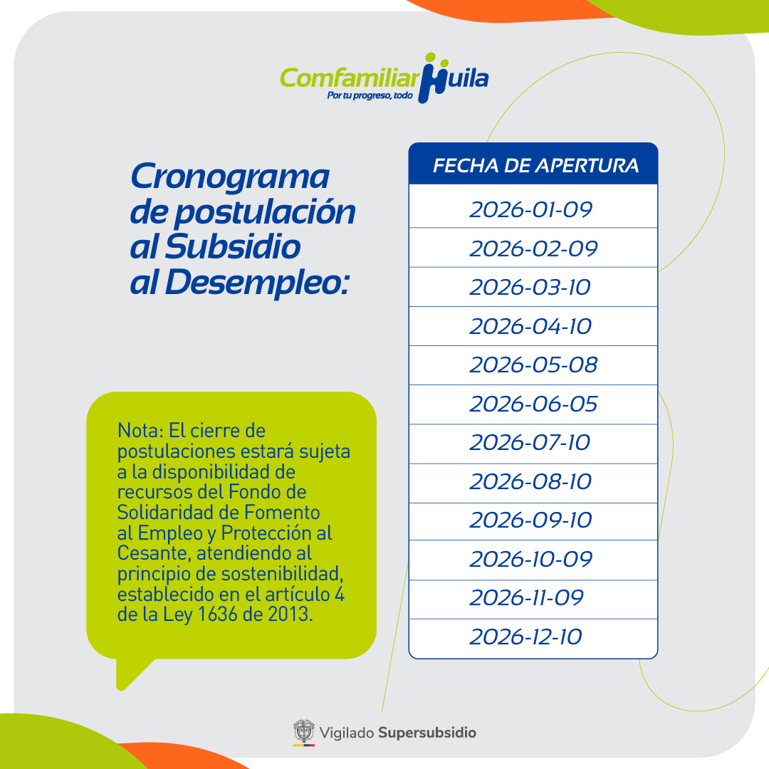 Tenga en cuenta: La postulación virtual únicamente estará habilitada de lunes a viernes de 9:00 am a 4:00 pm y de acuerdo al cronograma de postulación establecido por COMFAMILIAR HUILA, el cual podrá consultar dando Click Aquí
