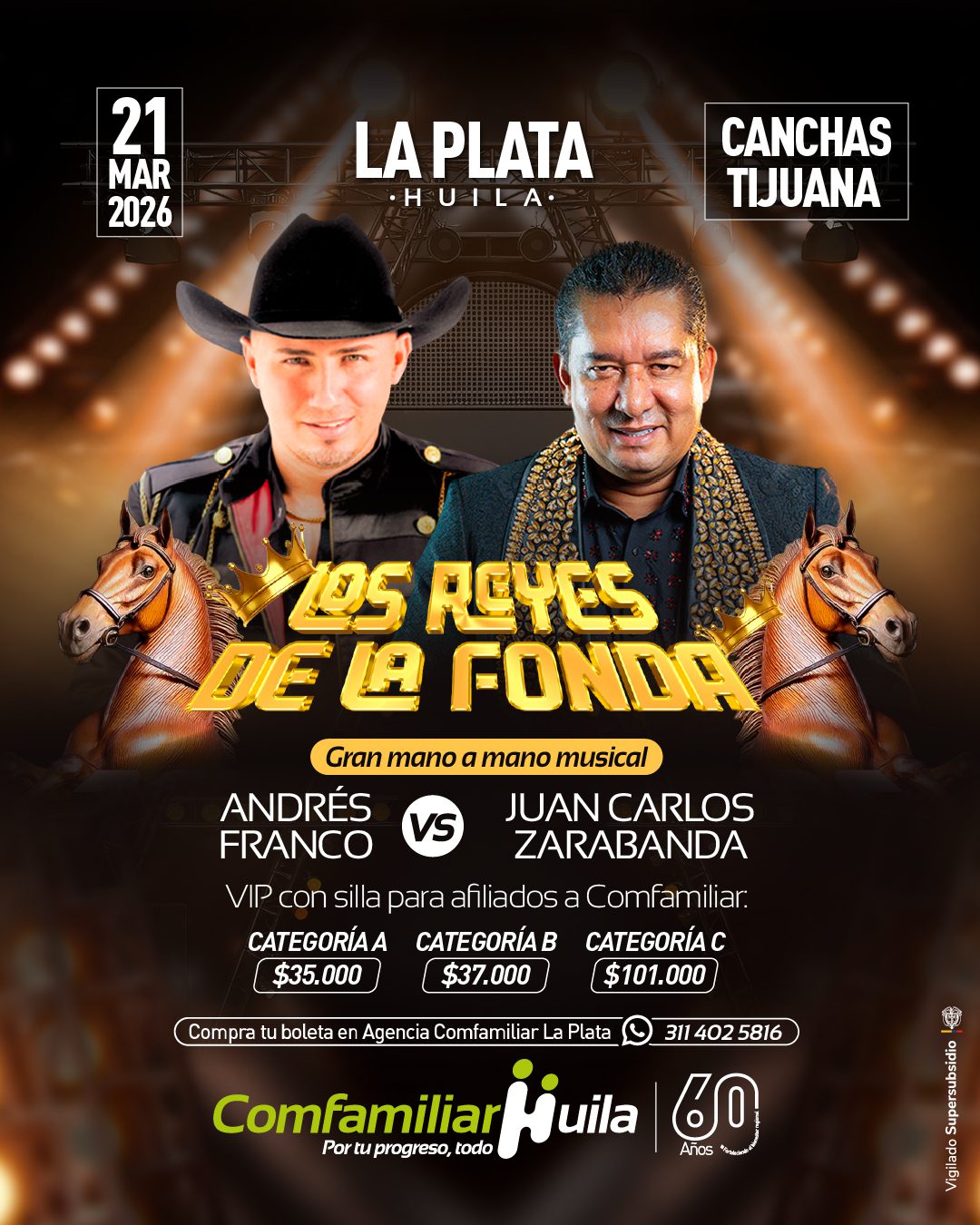 Comfamiliar Huila invita a sus afiliados y a la comunidad a disfrutar de una noche llena de música popular con el concierto “Los Reyes de la Fonda”, un espectacular mano a mano musical entre Andrés Franco y Juan Carlos Zarabanda, que se realizará el 21 de marzo de 2026 en el municipio de La Plata, Huila.