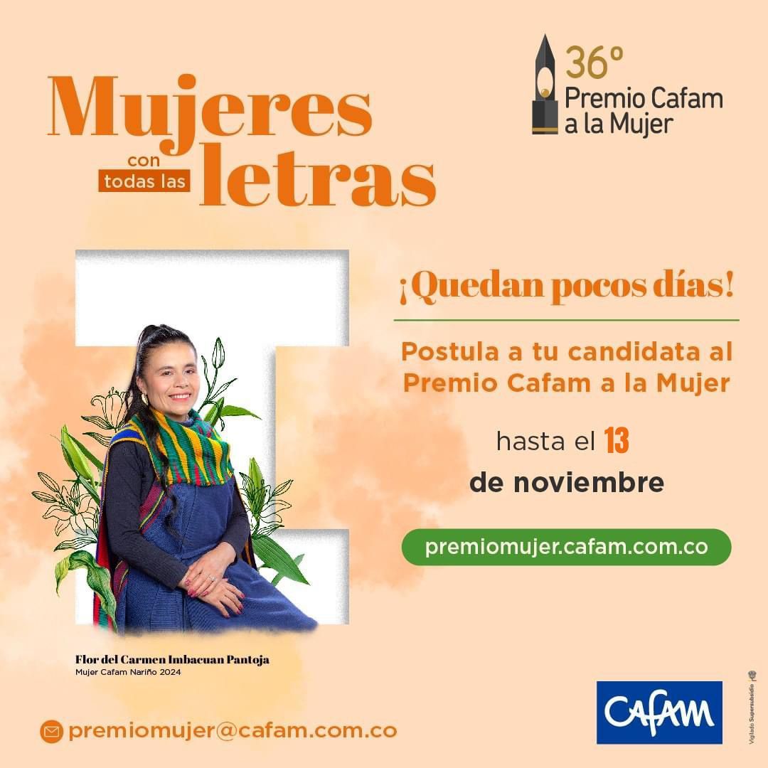 Los interesados pueden postular a sus candidatas a este galardón, a esas mujeres que tienen historias por contar y poblaciones por defender. La convocatoria para la postulación de las finalistas por cada departamento estará abierta hasta el próximo 8 de noviembre. “Sabemos que en todo el territorio nacional existen MUJERES CON TODA LAS LETRAS, llenas de virtudes y fortalezas innumerables, y entre ellas se encuentra la próxima portadora de esta distinción tan importante en el país. Es un honor para mí iniciar esta etapa de convocatoria, en donde conoceremos cientos de historias de admirar y destacar, que nos demuestran que se puede trabajar desinteresadamente por el prójimo”, destacó Luis Gonzalo Giraldo Marín, director administrativo de Cafam.