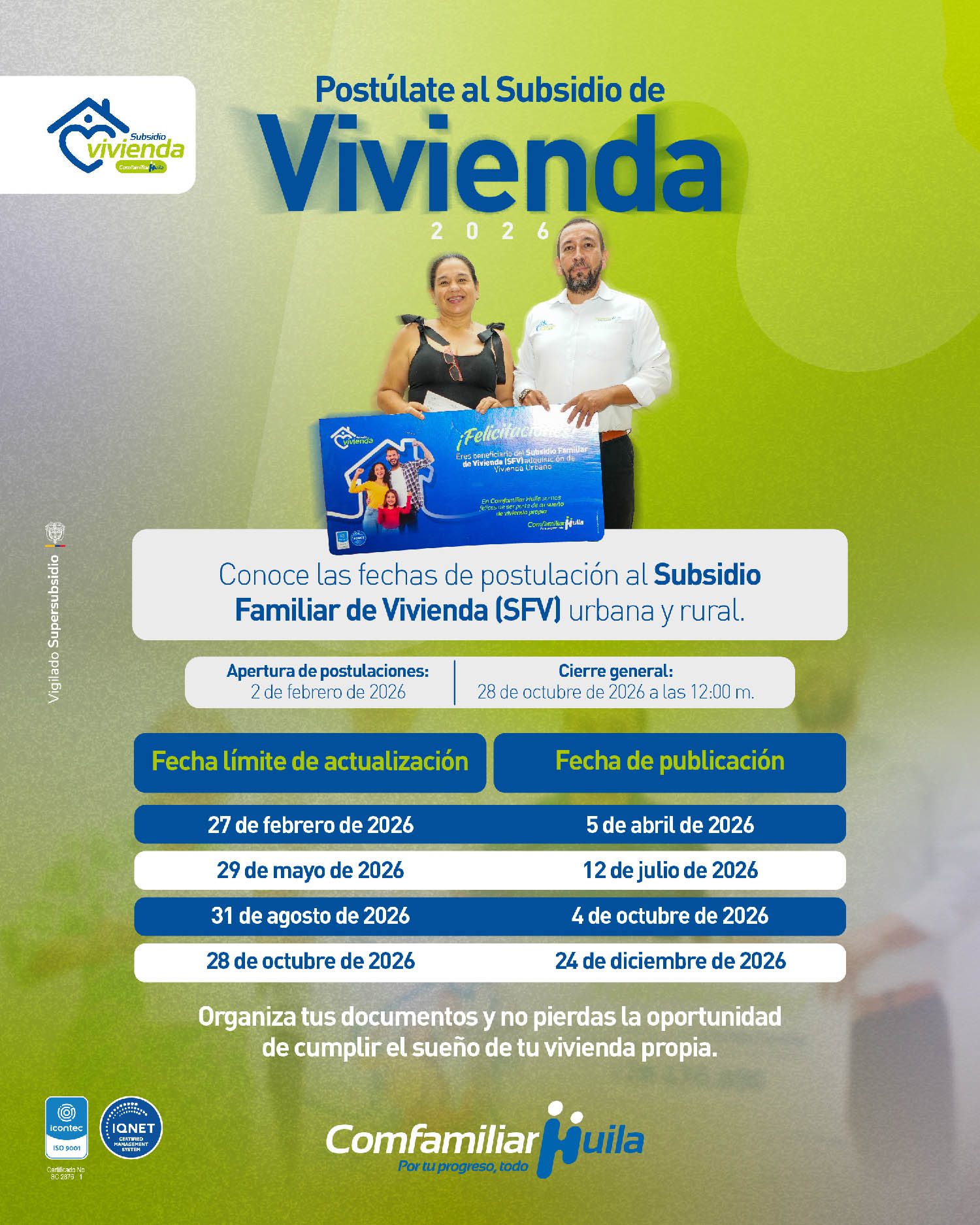 En Comfamiliar Huila seguimos trabajando para que más familias hagan realidad el sueño de tener vivienda propia. Por eso, ya se encuentra habilitado el cronograma de postulación al Subsidio Familiar de Vivienda (SFV) 2026, tanto en modalidad urbana como rural, una oportunidad pensada para apoyar a nuestros afiliados en la adquisición o mejoramiento de su hogar.