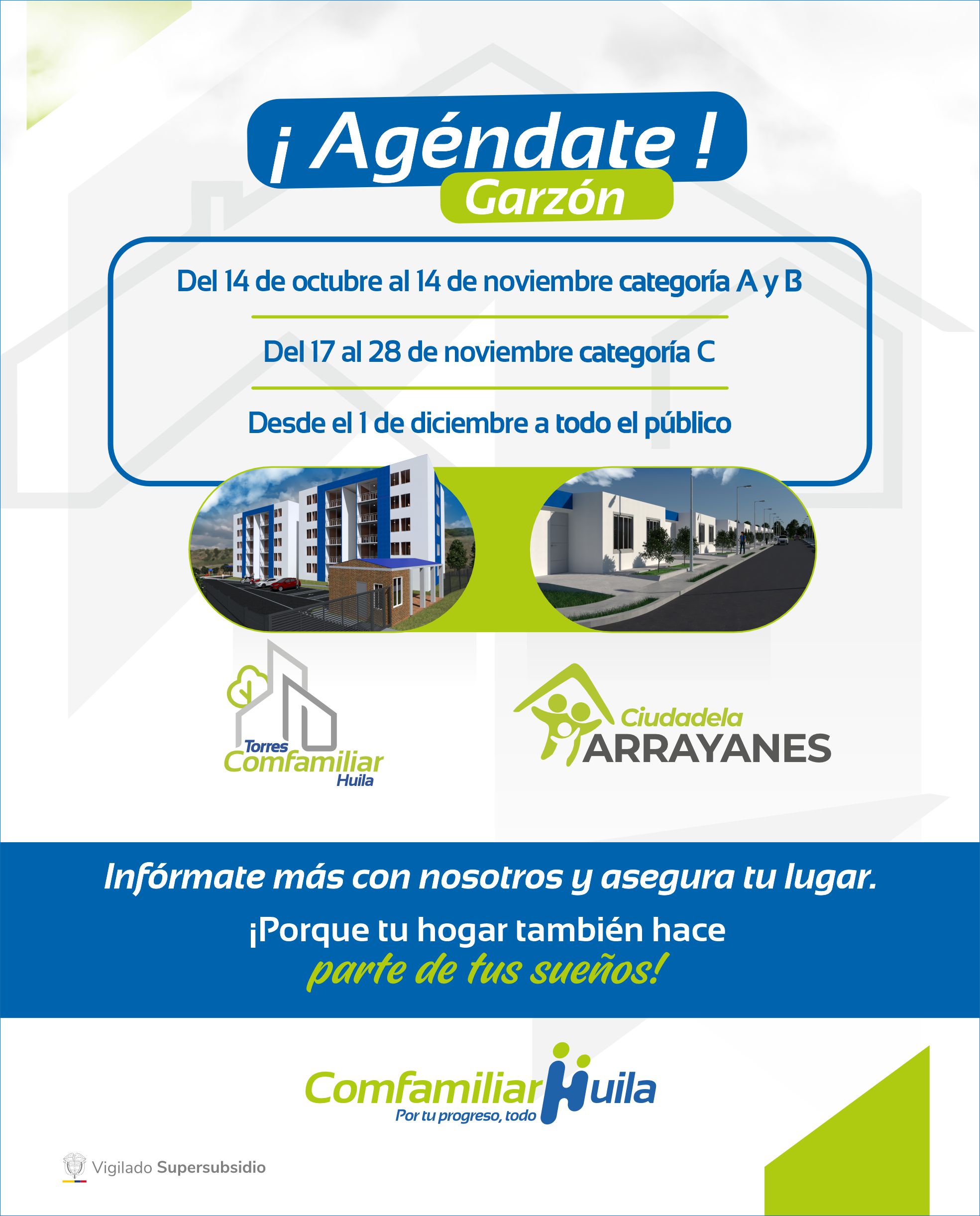 En Comfamiliar Huila seguimos construyendo bienestar y progreso para las familias huilenses. Por eso, llegan a Garzón dos grandes proyectos de vivienda: Ciudadela Arrayanes y Torres Comfamiliar, pensados para que más familias puedan cumplir el sueño de tener casa propia, con la posibilidad de aplicar su subsidio de vivienda otorgado por la Caja de Compensación.