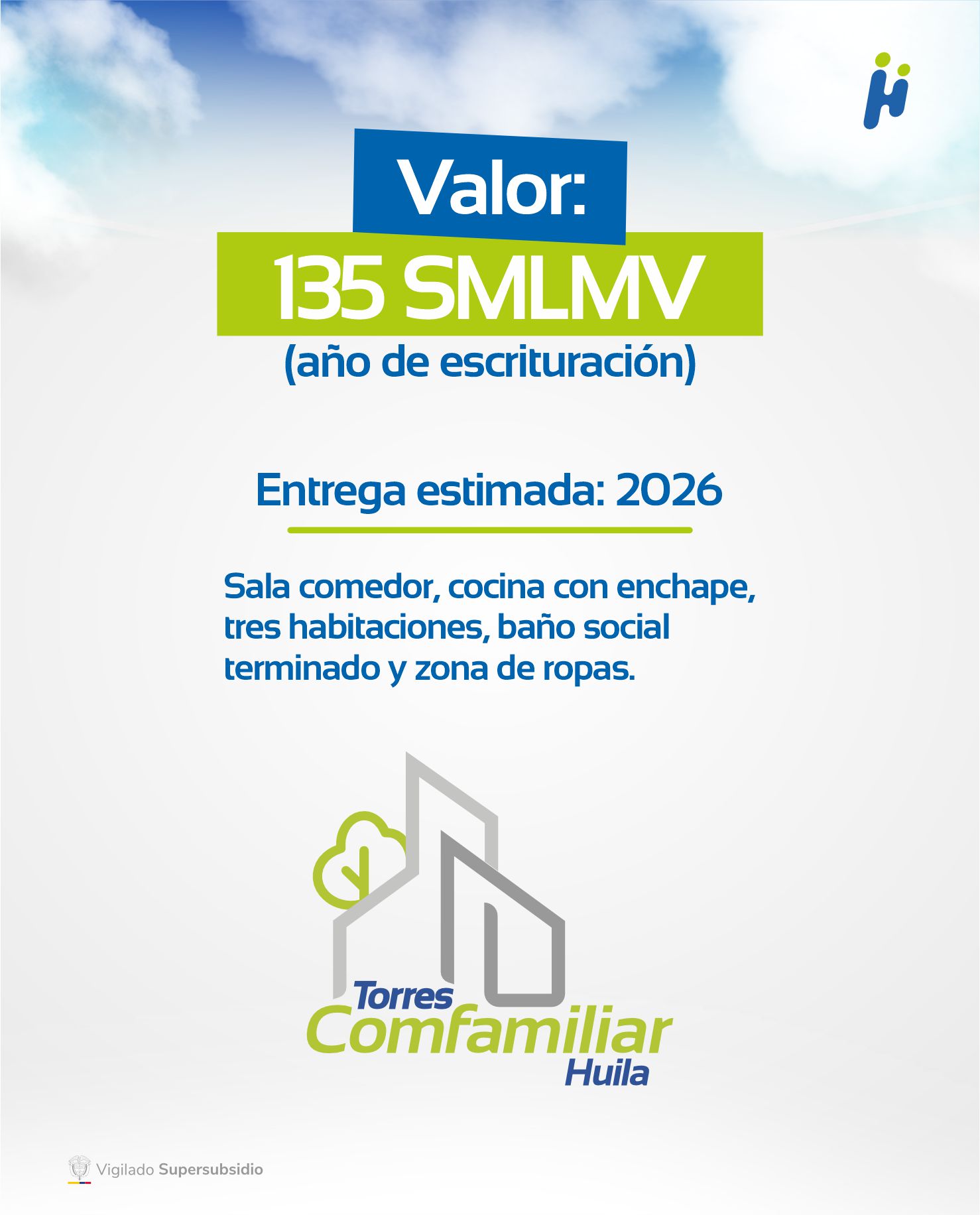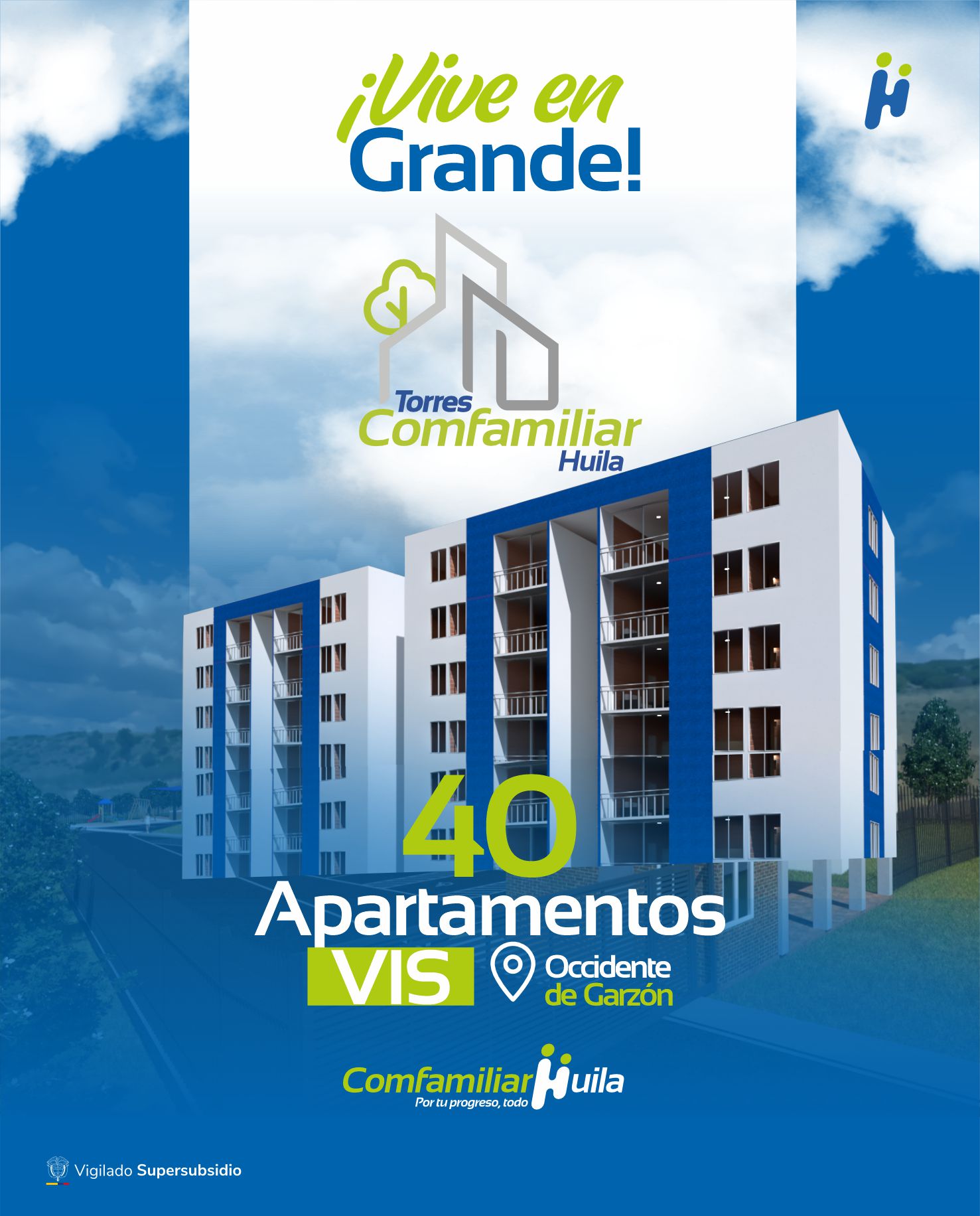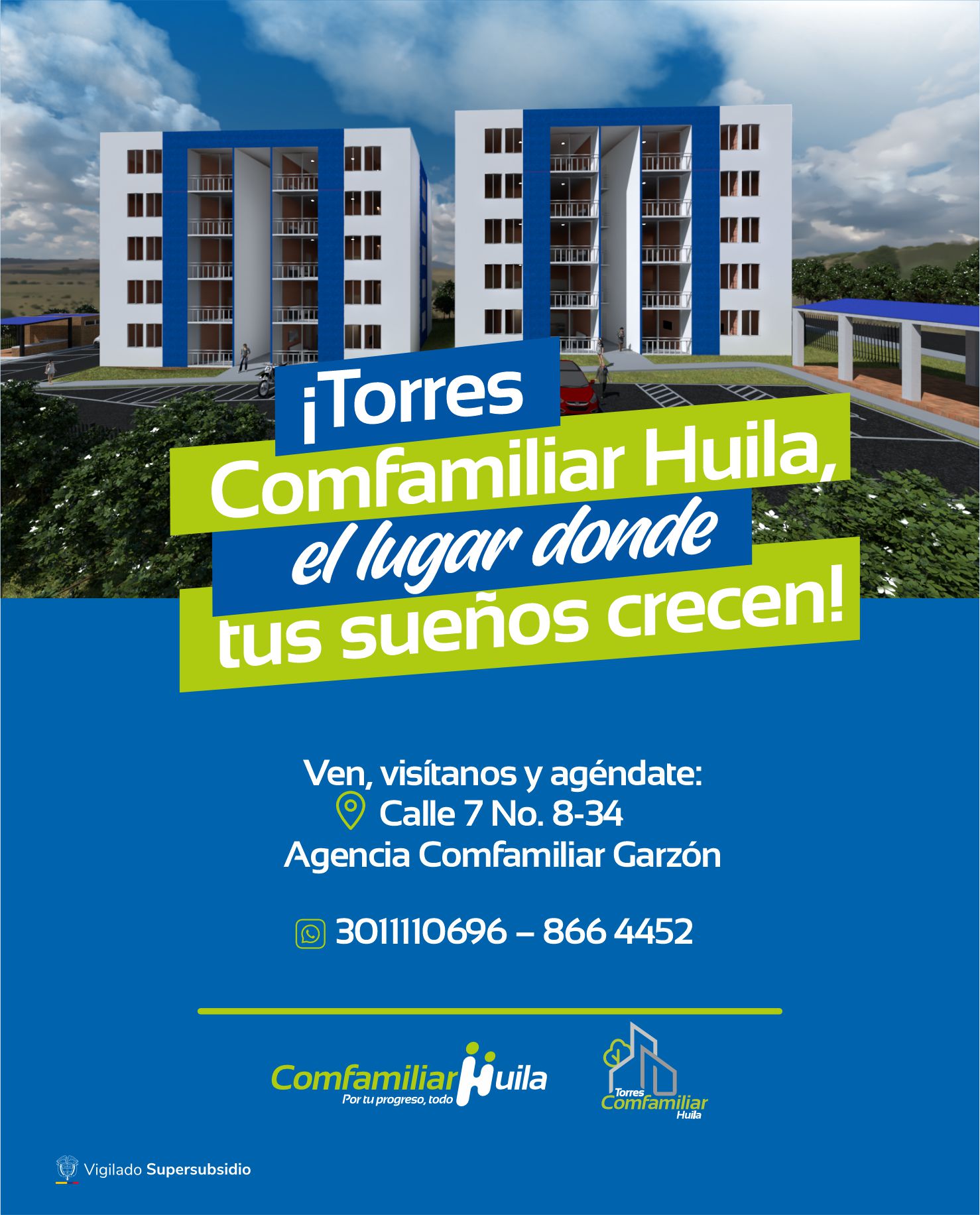Torres de Comfamiliar es un proyecto VIS ubicado en el occidente de Garzón. Consta de dos torres de cinco pisos con urbanización cerrada, zonas comunes y apartamentos amplios de 74,5 m².