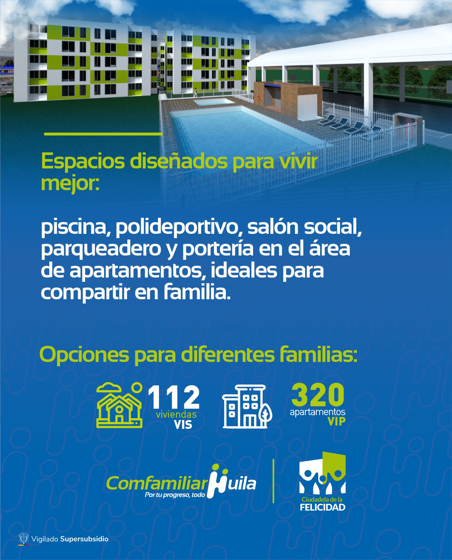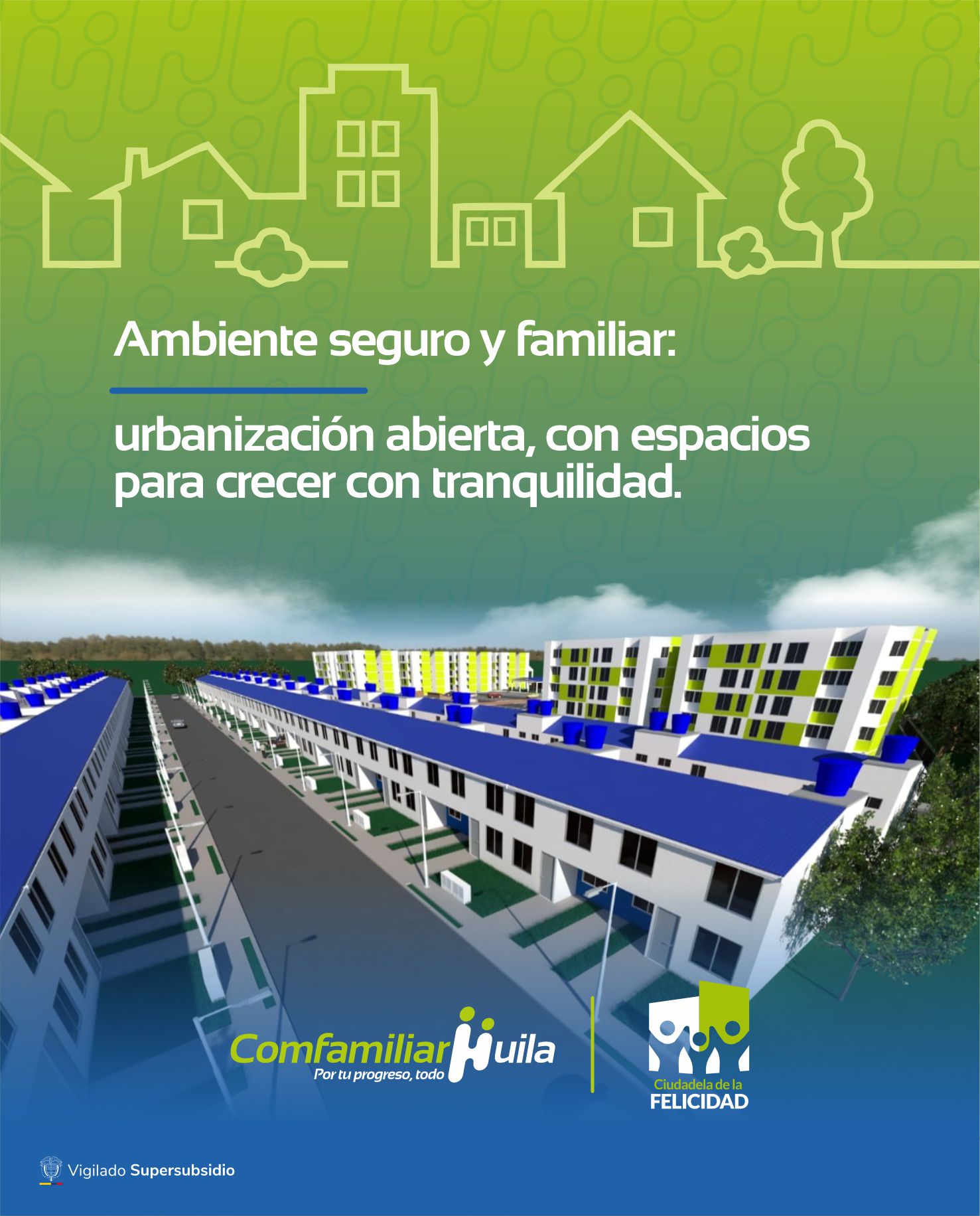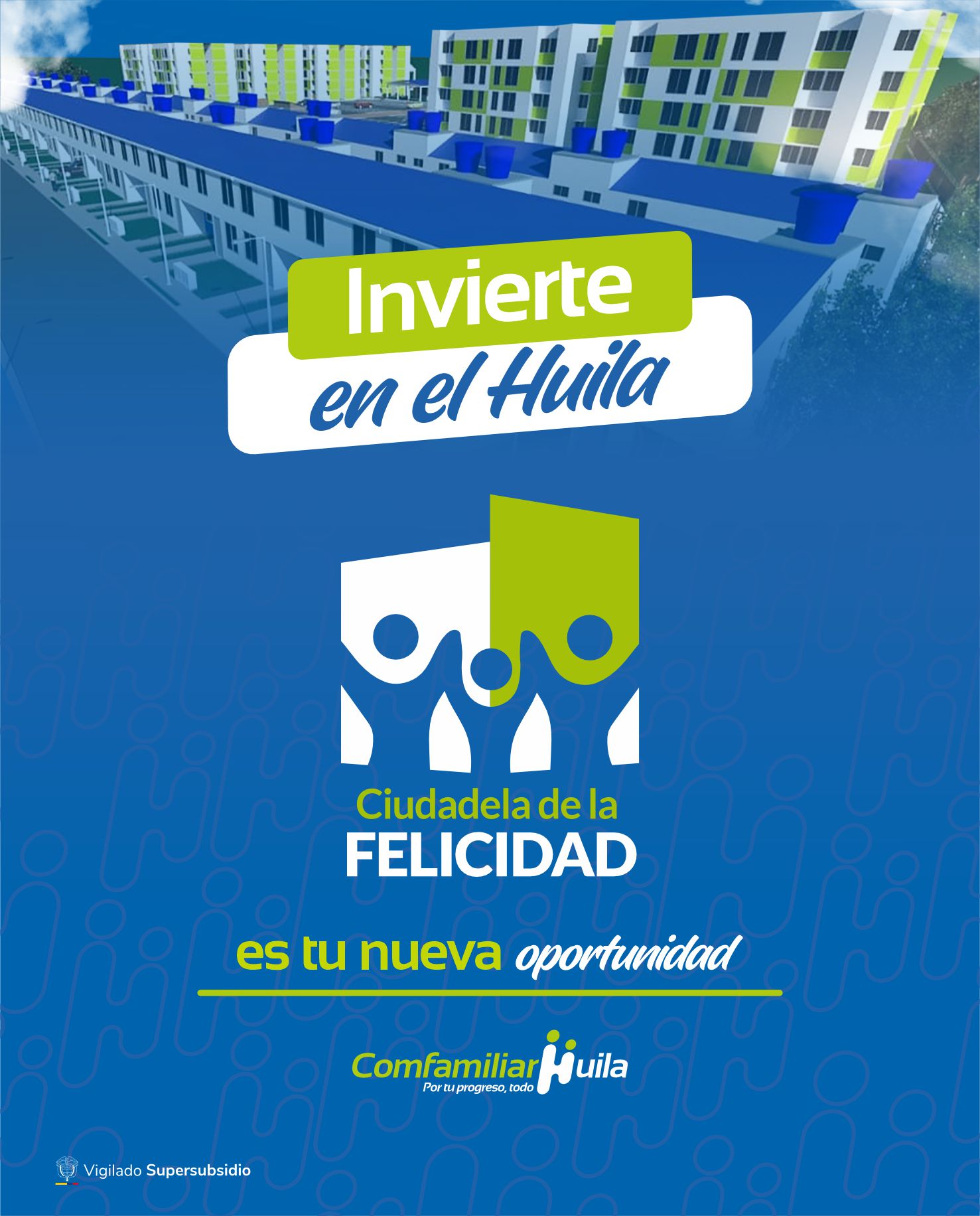 Ciudadela de la Felicidad es un proyecto de vivienda VIS y VIP ubicado en la ciudad de Neiva, diseñado para brindar comodidad, bienestar y espacios modernos a las familias afiliadas a Comfamiliar Huila. Cuenta con casas y apartamentos que ofrecen excelentes áreas, zonas comunes y un esquema de pago accesible.