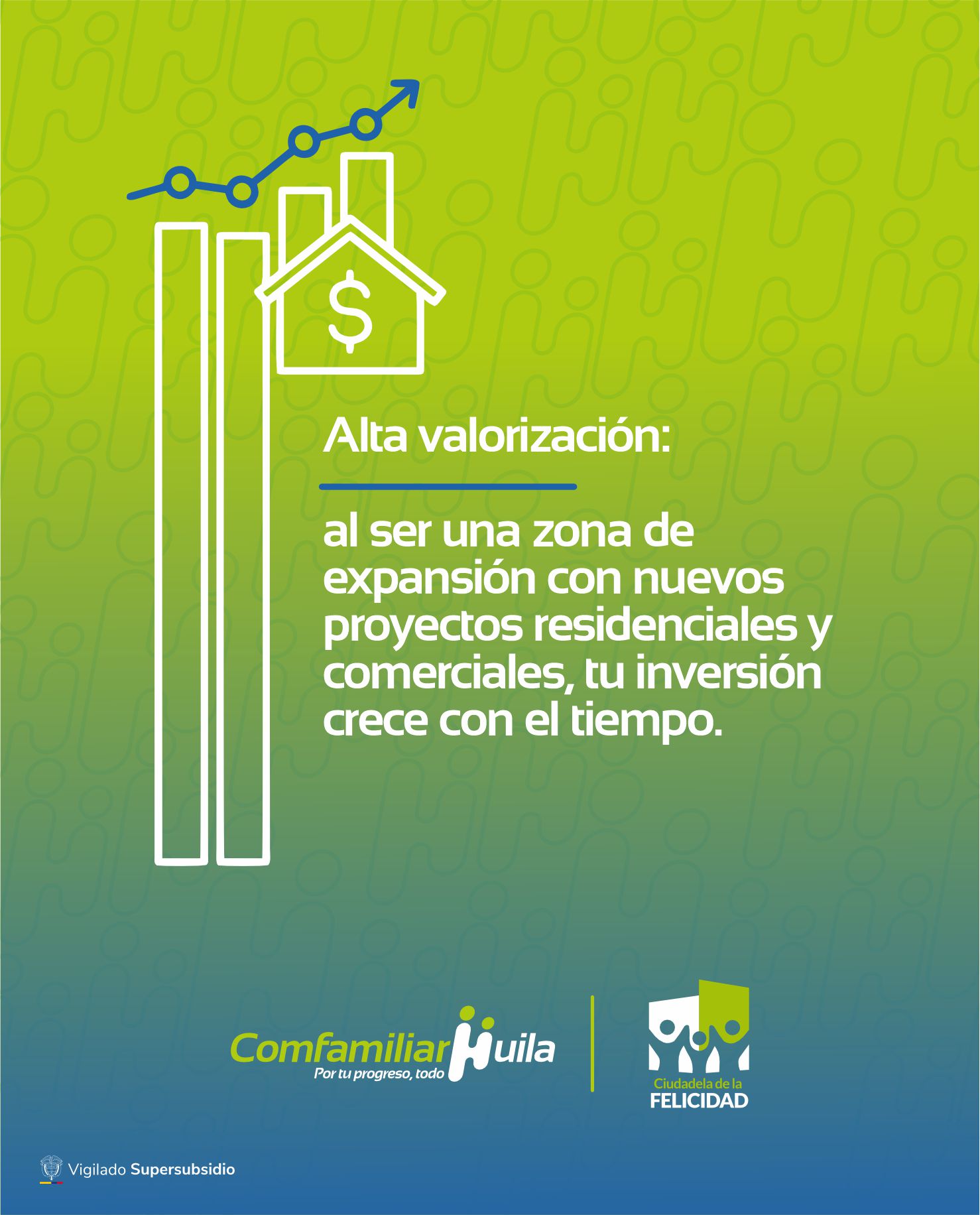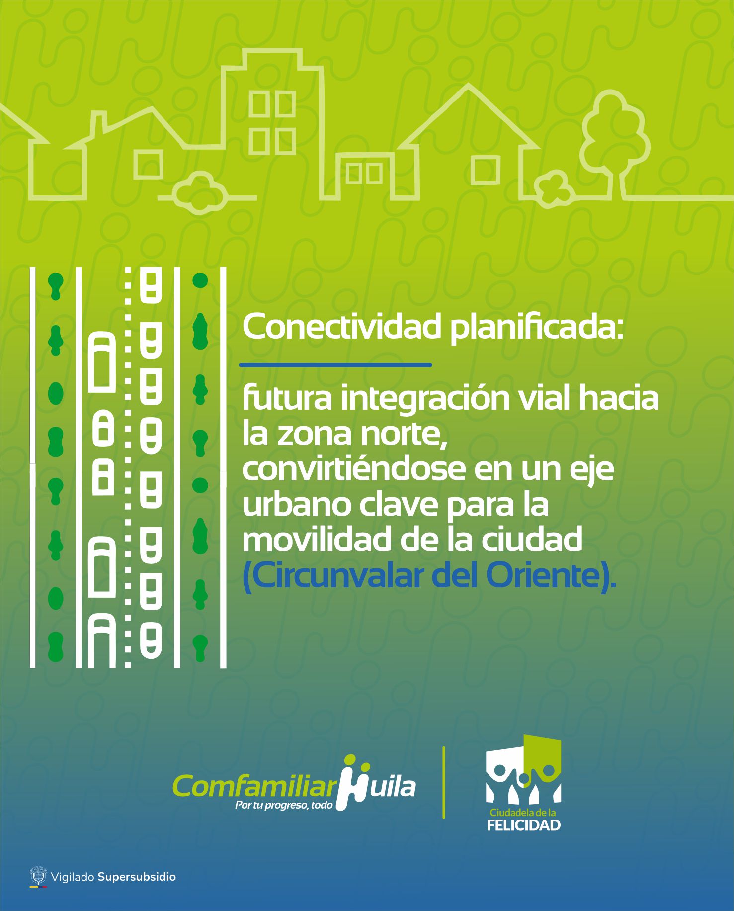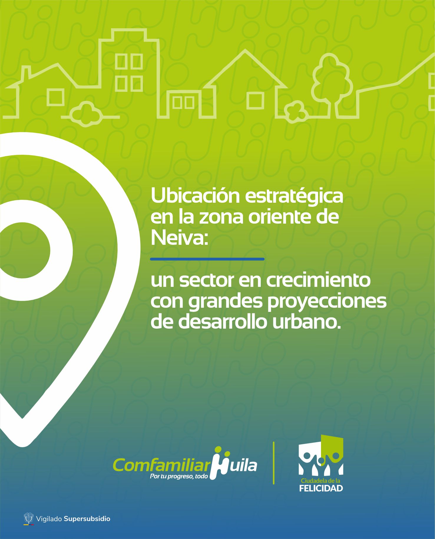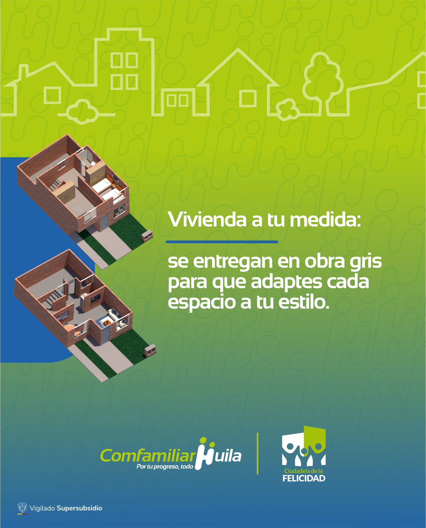 Ciudadela de la Felicidad es un proyecto de vivienda VIS y VIP ubicado en la ciudad de Neiva, diseñado para brindar comodidad, bienestar y espacios modernos a las familias afiliadas a Comfamiliar Huila. Cuenta con casas y apartamentos que ofrecen excelentes áreas, zonas comunes y un esquema de pago accesible.