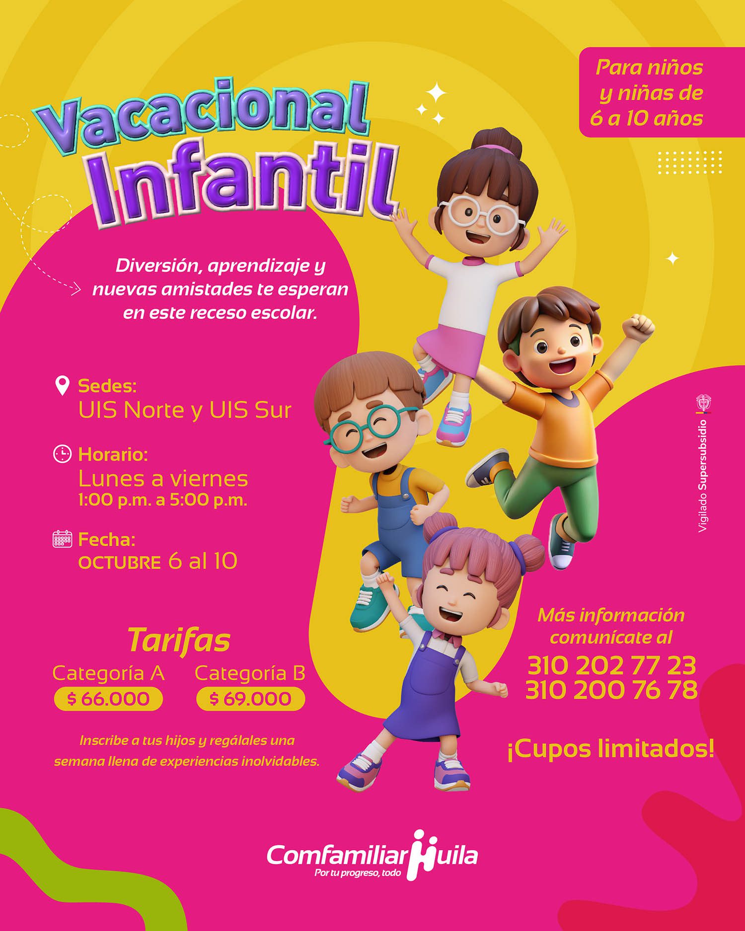 En Comfamiliar Huila seguimos creando experiencias que promueven el bienestar, el aprendizaje y la integración de los más pequeños. Por eso, invitamos a los niños y niñas de 6 a 10 años a participar en el Vacacional Infantil, un espacio diseñado para aprovechar el receso escolar con actividades llenas de alegría, conocimiento y nuevas amistades.