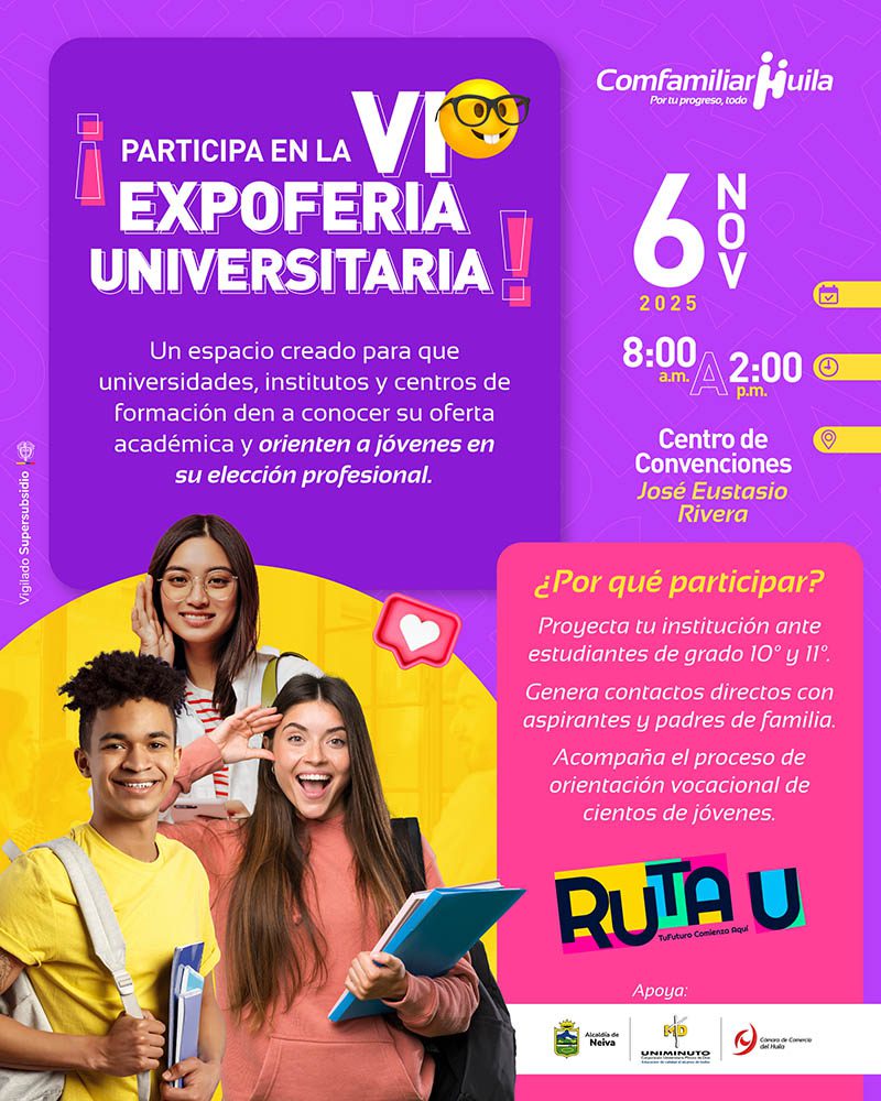 El próximo 6 de noviembre de 2025, en el Centro de Convenciones José Eustasio Rivera, se llevará a cabo la VI Expoferia Universitaria, un evento organizado por Comfamiliar Huila a través del Centro de Formación Empresarial, que busca fortalecer la orientación vocacional de los jóvenes del Huila.